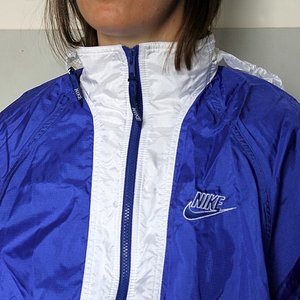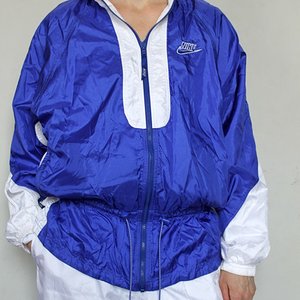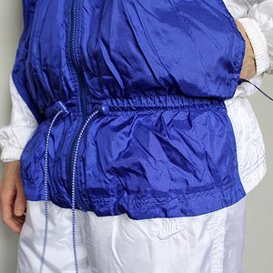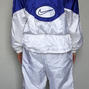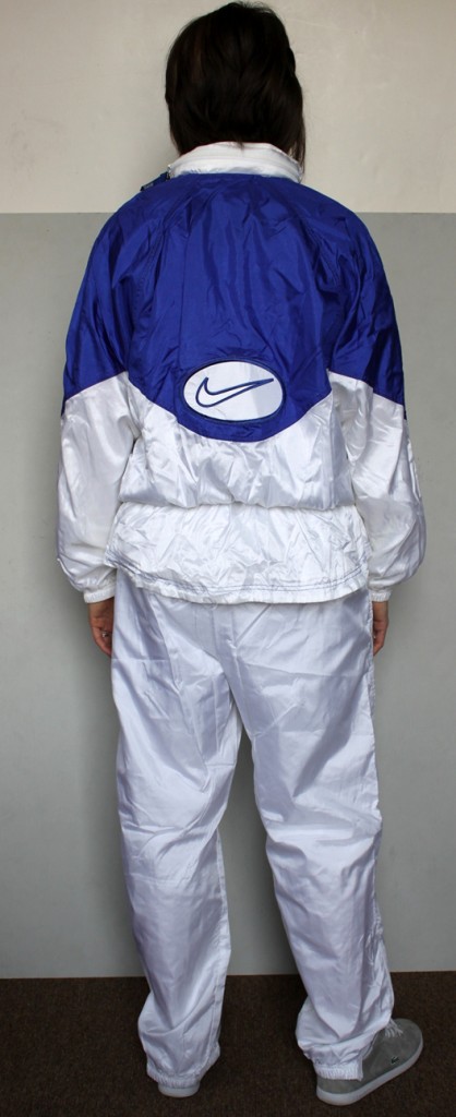 Woman in blue and white Nike shellsuit , back shot